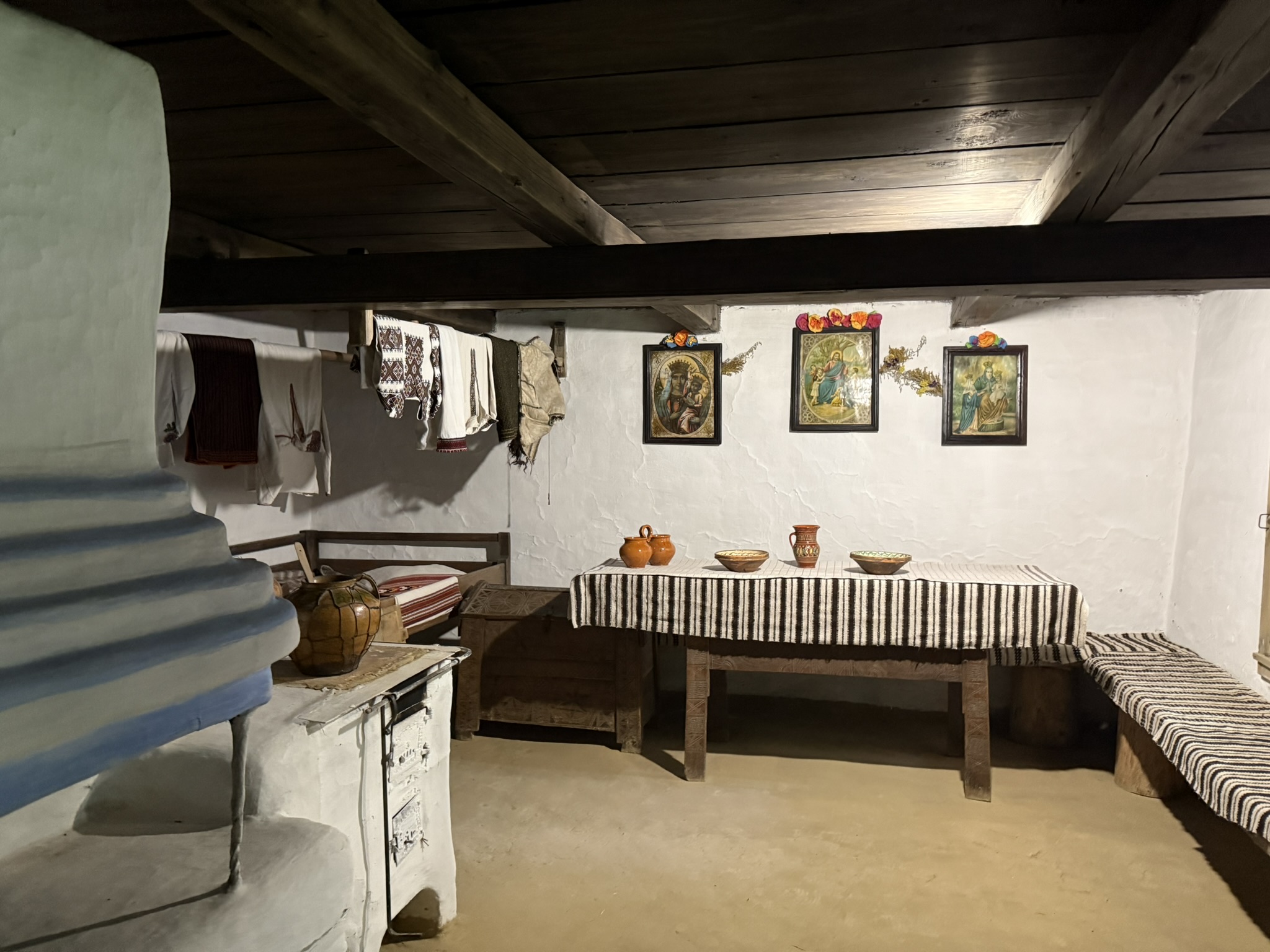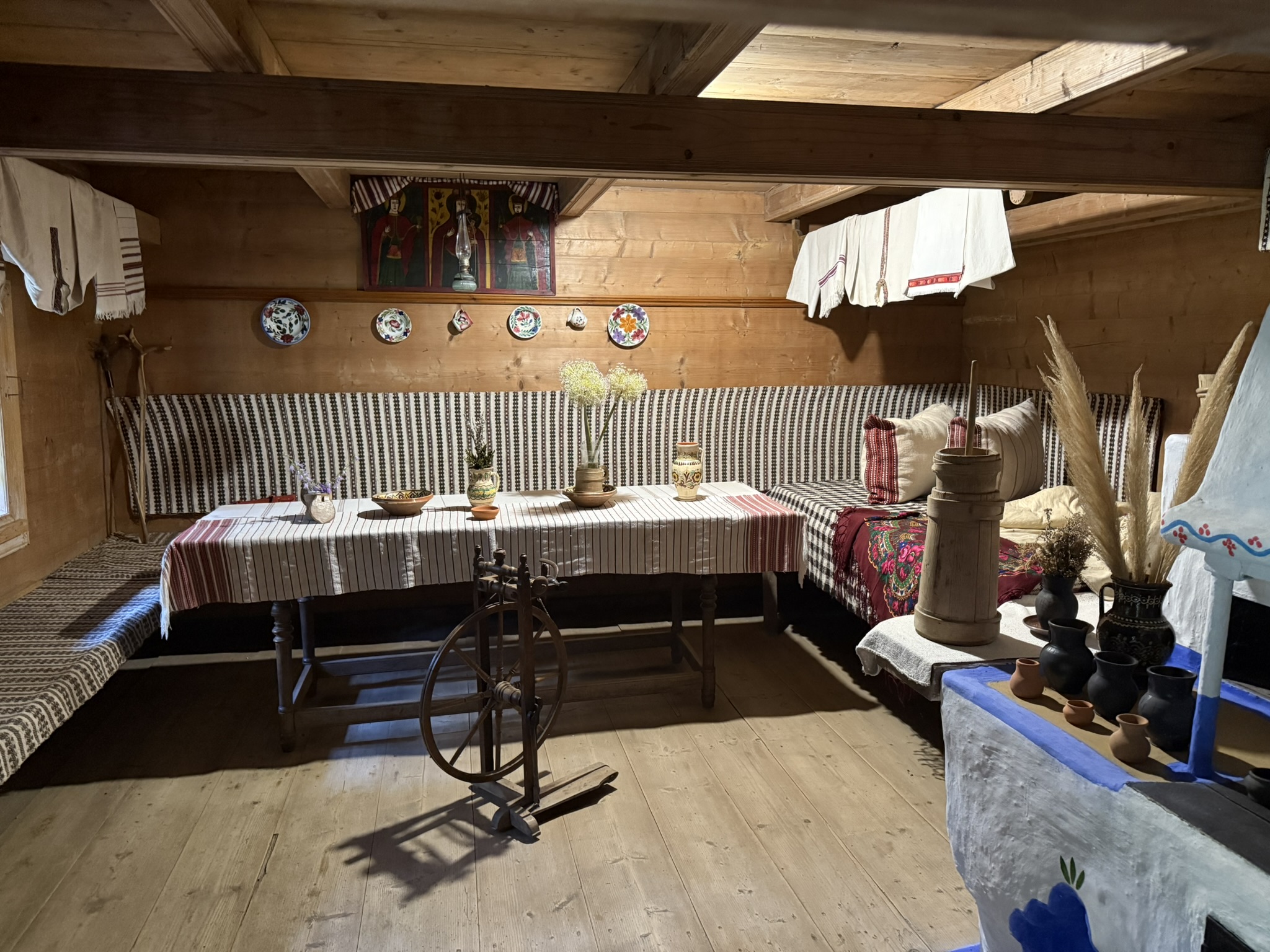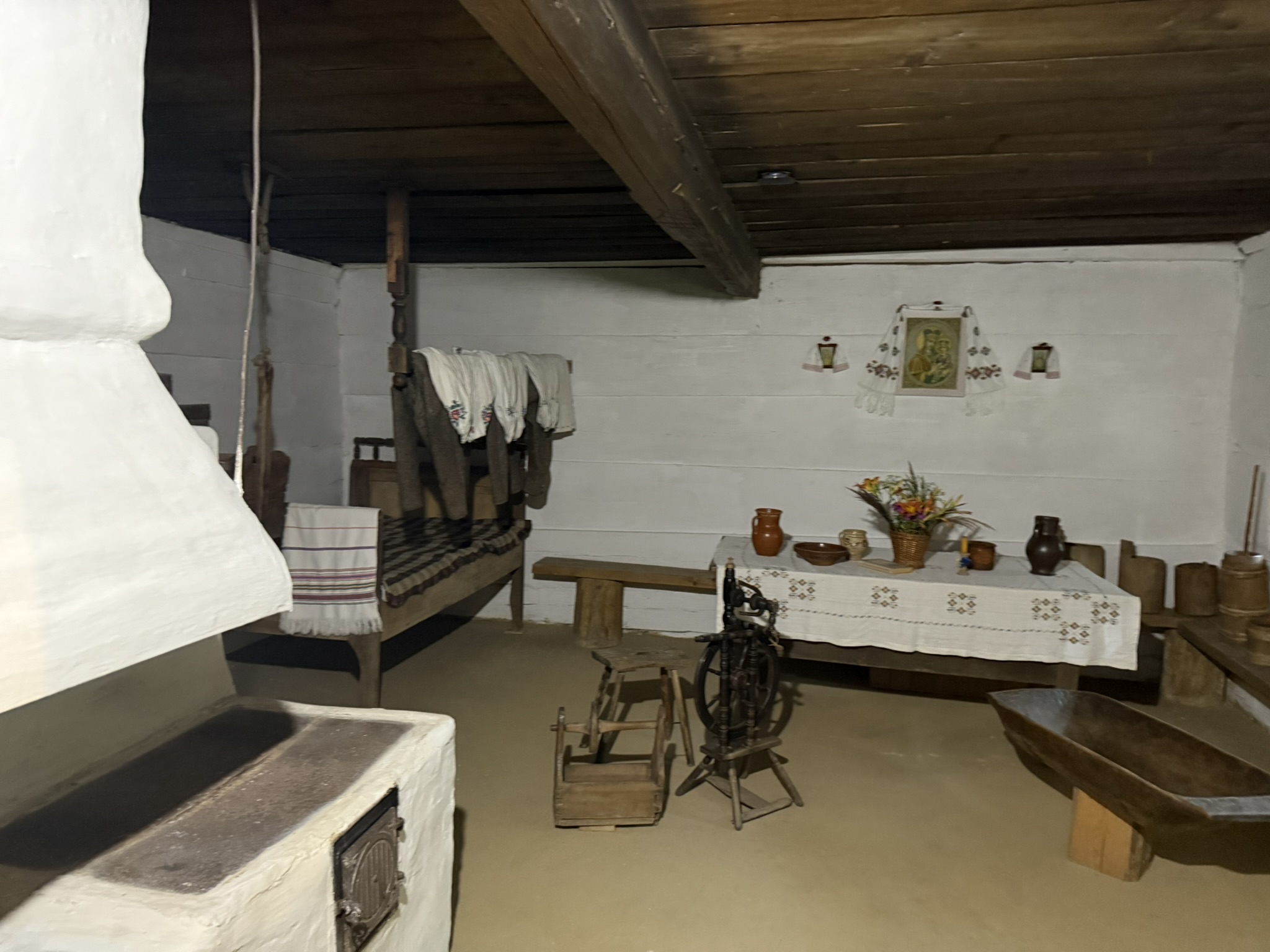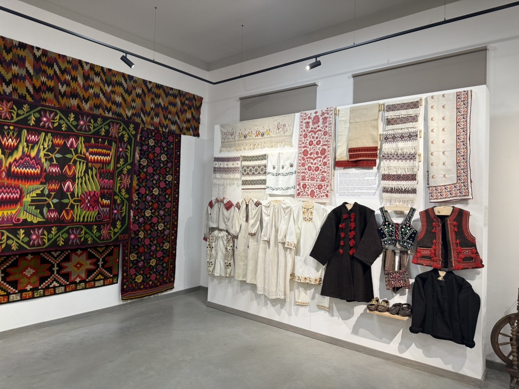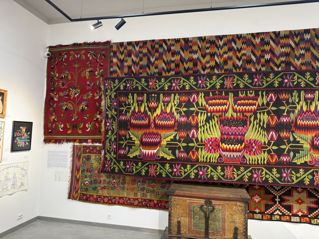 One of the buildings hosted an exposition โ pysanky, old tools, carpets, artistic paintings, pieces of clothing and other old items were on display.