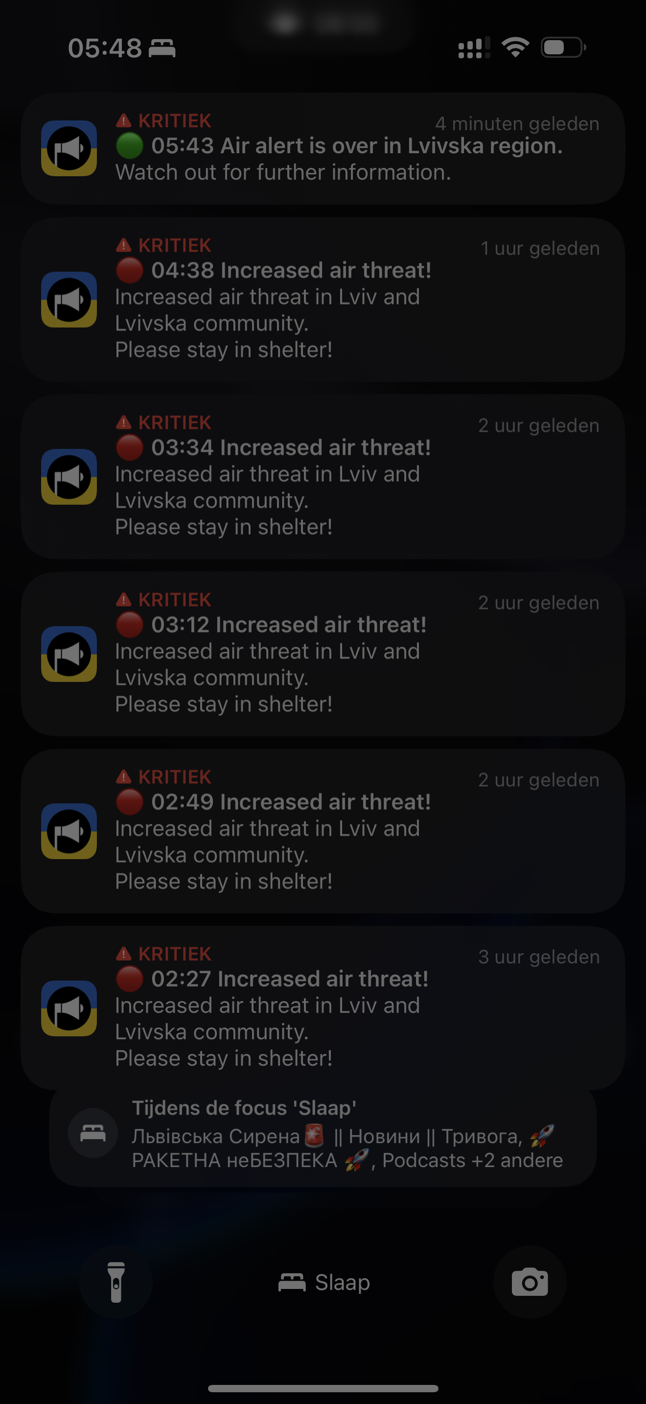 While I was the underground shelter during the nights, I tried to sleep with noise-cancelling headphones. It was bearable, but others I know didn't have those conditions. Some co-students and teachers in Lviv reported not waking from any of the air raid alerts — intended to be loud and waking! — but only woke by the sound of anti-air defences launching, shooting down drones or explosions of such drones right outside their windows.