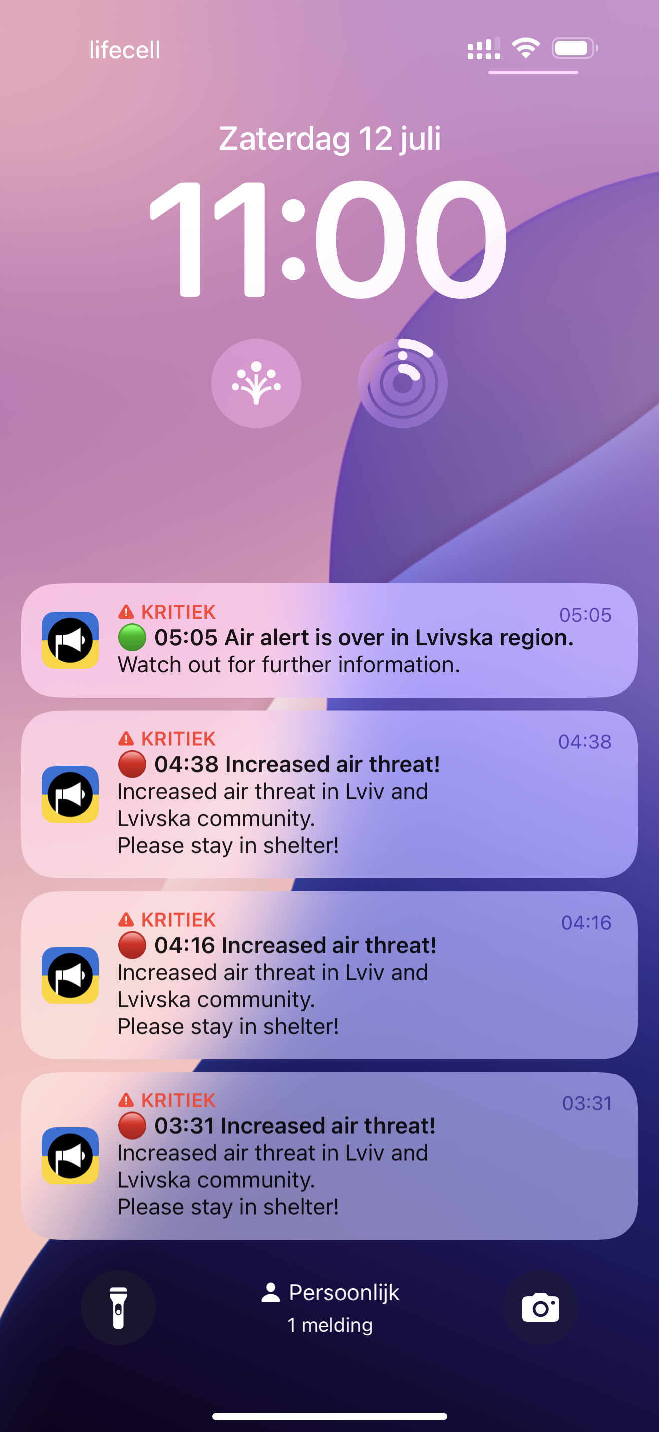 During the nightly attacks on 9 and 12 July, I've been getting extra alerts on my watch and mobile phone — "Increased air threat!" every so often. I suppose the air raids are so normal that people don't always take them seriously initially. I didn't get those extra messages in my first three weeks in Lviv, so when I see those messages — I'm taking it seriously.